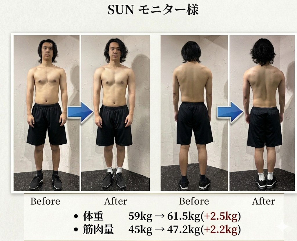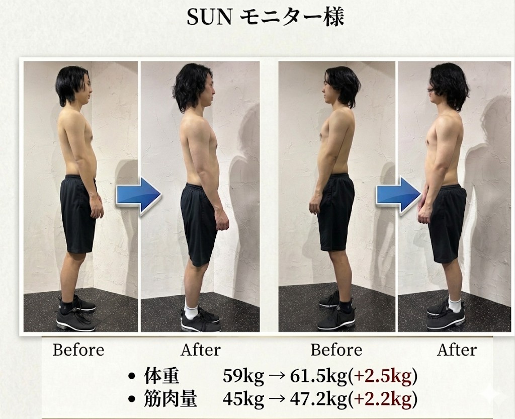 フォームや身体の使い方(特に腹圧や肩甲骨の使い方)を教えていただいたことで、同じ種目でも効き方や安定感が大きく変わったのが一番の変化でした。1人でYouTube見てやっていたときから大切だということは知っていたものの、正解が分からなかったので感覚をしっかり反復できたこともよかったです。 その結果、筋肉量もちゃんと増えてきており、体重を増やすことができました。